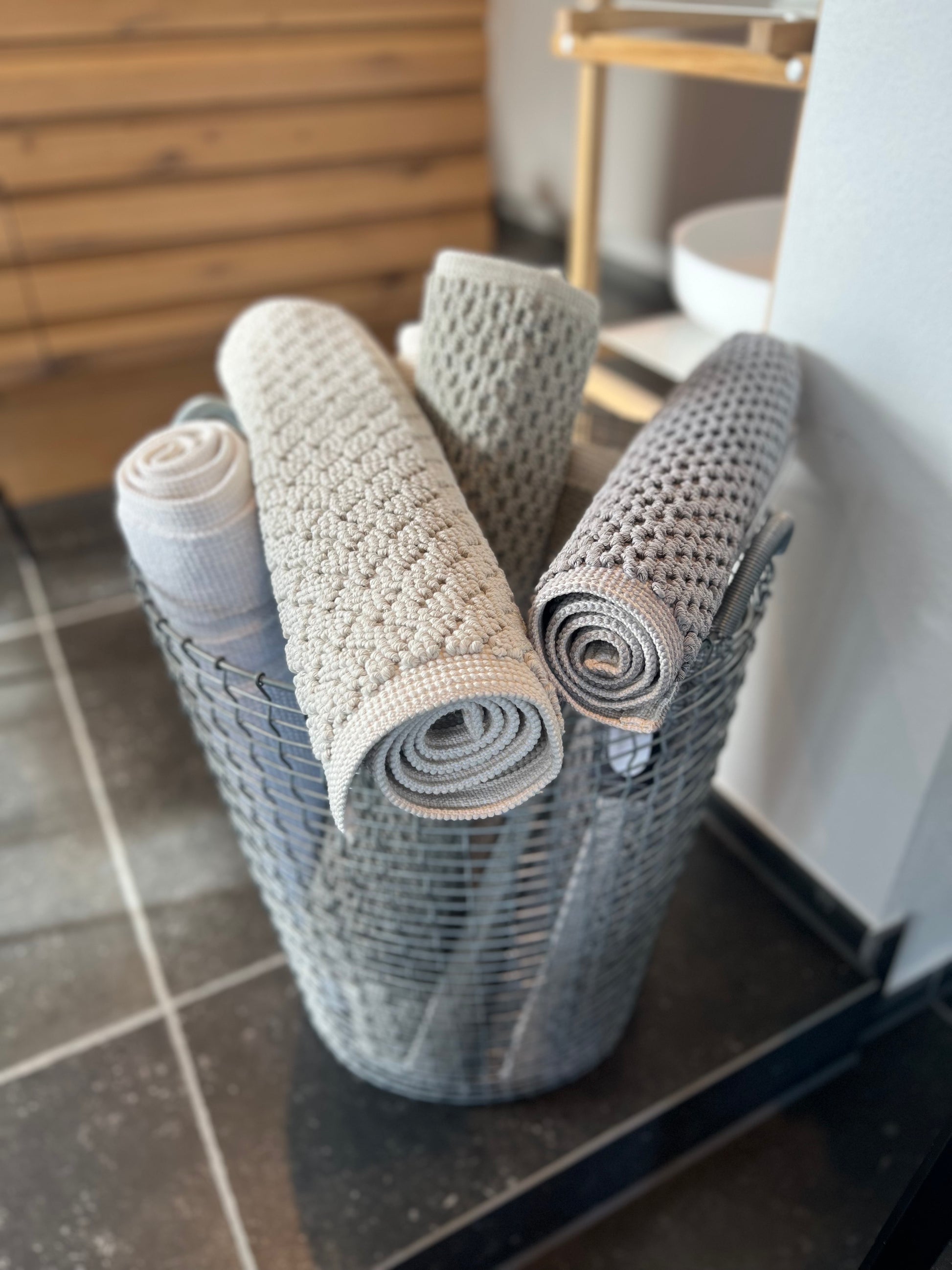 Weiche Badematte aus Baumwolle mit hochwertig gewebter Wabenstruktur, gefertigt in einer Weberei auf Sardinien. Dank der traditionellen sardischen Webtechnik besonders robust.