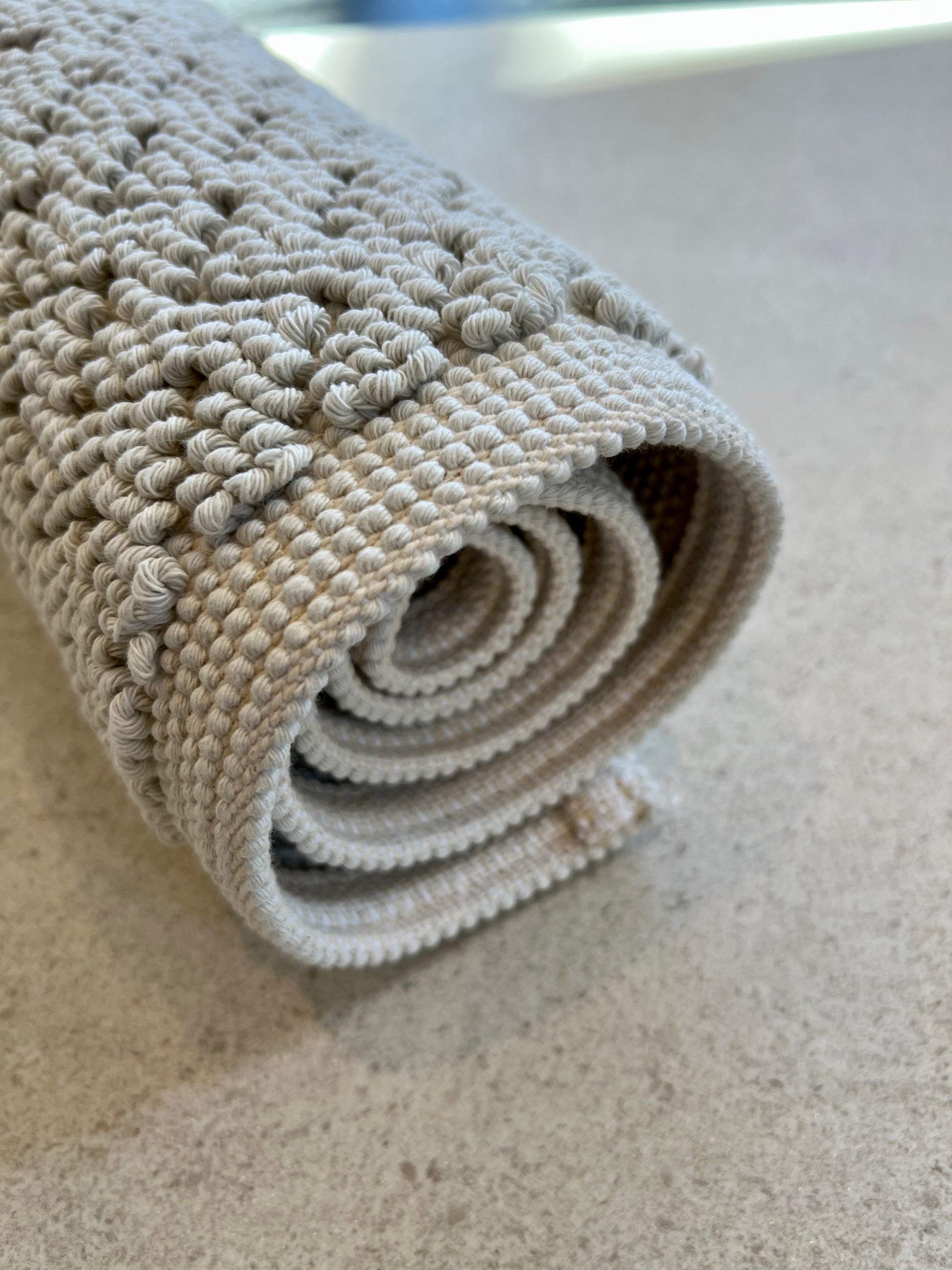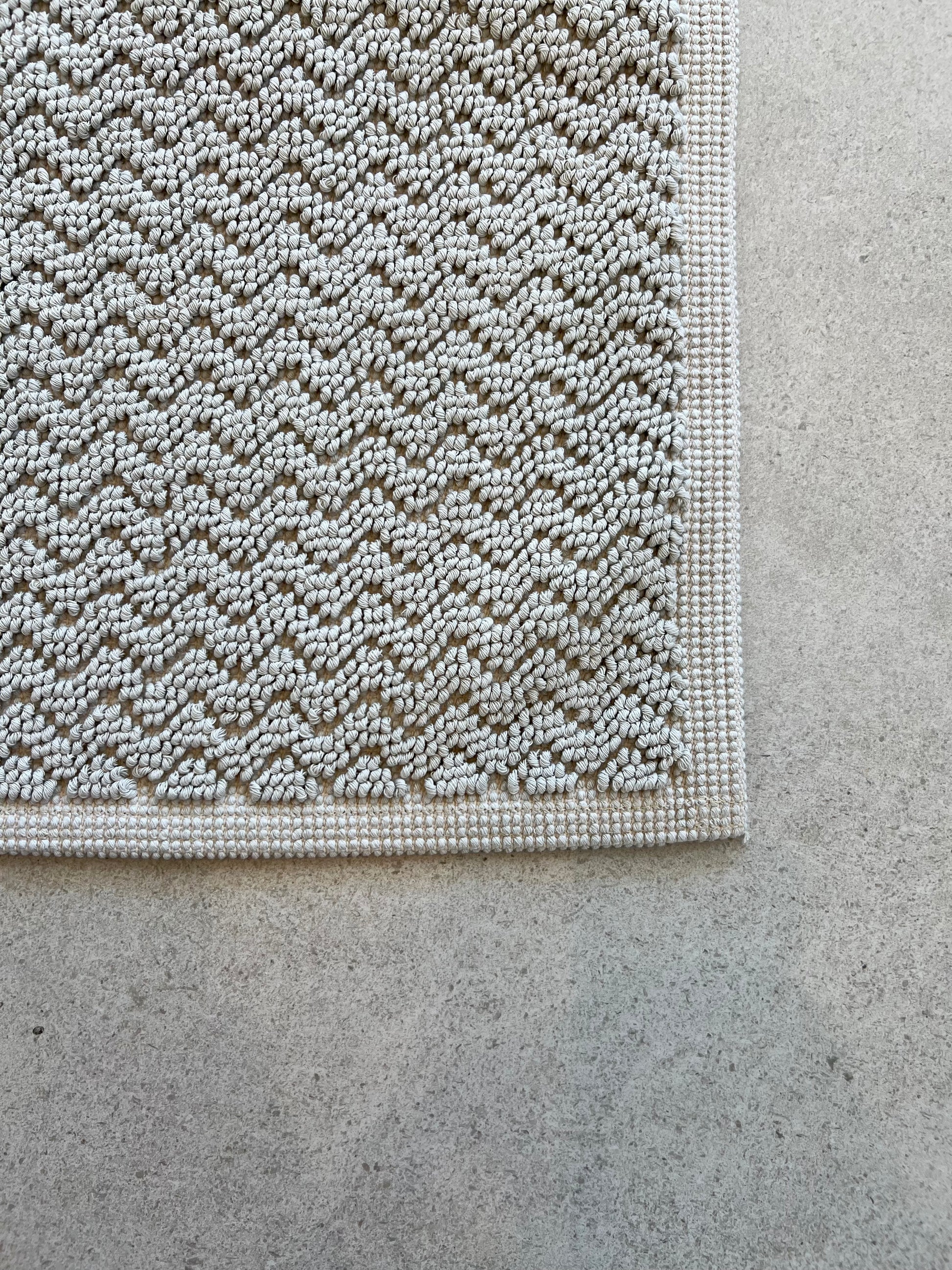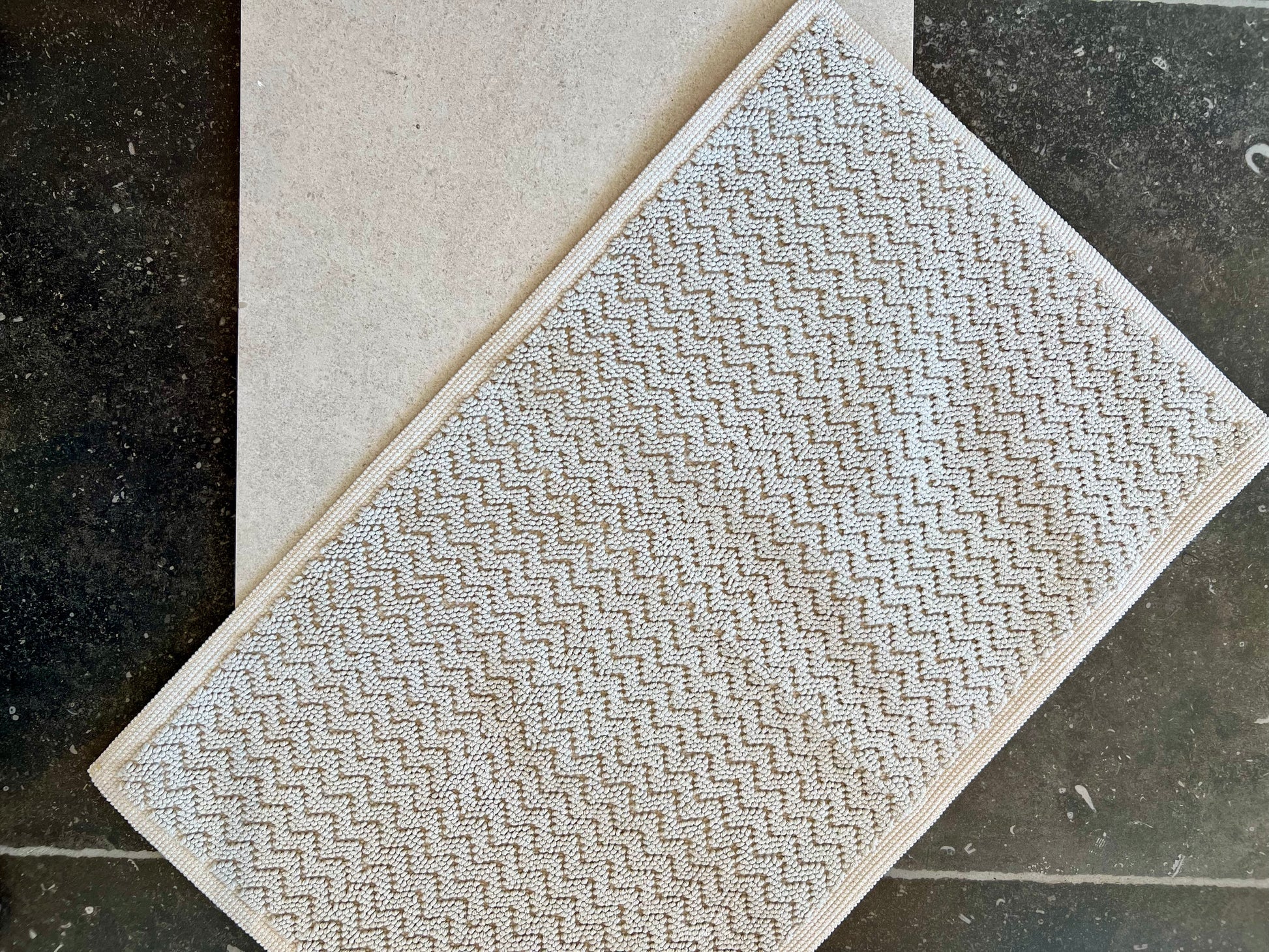 Weiche Badematte aus Baumwolle mit hochwertig gewebter zickzack Struktur, gefertigt in einer Weberei auf Sardinien. Dank der traditionellen sardischen Webtechnik besonders robust. Die Farbe ist ein kühles beiges - passt sehr gut zu Nude- und Sandtönen.
