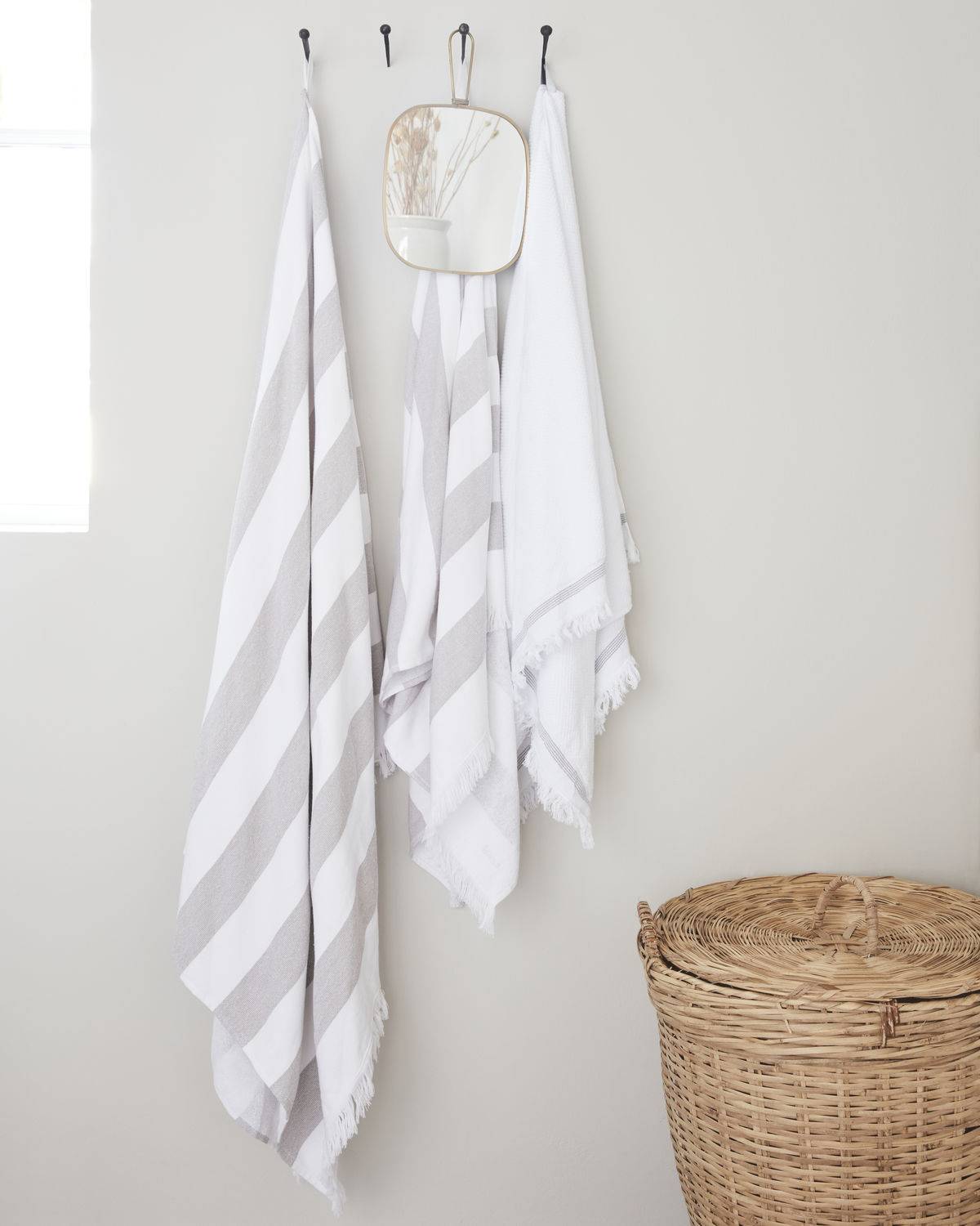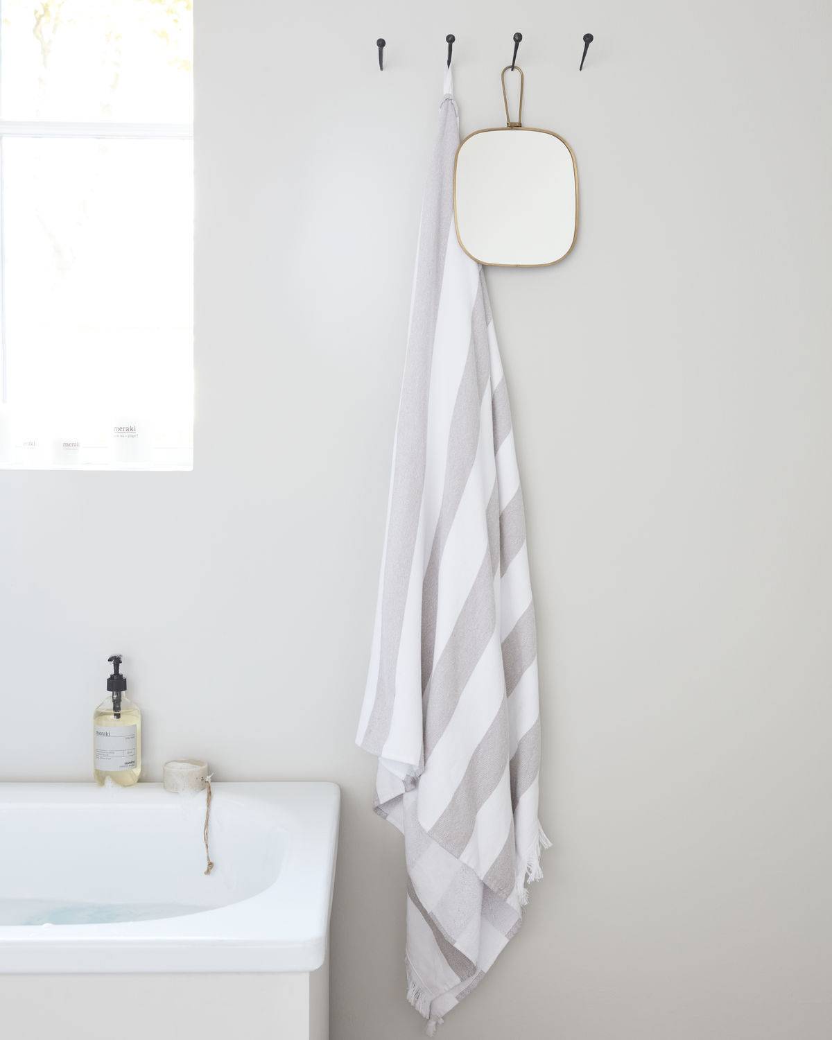 Set aus zwei gestreiften Baumwollhandtüchern von Meraki mit raffinierten Design. Eine Seite ist in normalem Baumwollgewebe gehalten, die andere Seite bietet mit einem Frotteegewebe maximalen Komfort. Mit den neutralen Streifen in Weiß und Braun passen sie in jedes Badezimmer. Die Fransen runden den Look ab und sorgen dafür, dass die Handtücher zu einem hübschen Bestandteil deiner Badezimmerdeko werden.