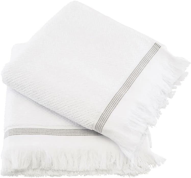 Baumwollhandtücher von Meraki mit raffinierten Design (im Gästehandtuchformat im Set mit 2 Stück). Eine Seite ist in normalem Baumwollgewebe gehalten, die andere Seite bietet mit einem Frotteegewebe maximalen Komfort. Mit den neutralen Streifen in Weiß und Braun passen sie in jedes Badezimmer. Die Fransen runden den Look ab und sorgen dafür, dass die Handtücher zu einem hübschen Bestandteil deiner Badezimmerdeko werden.