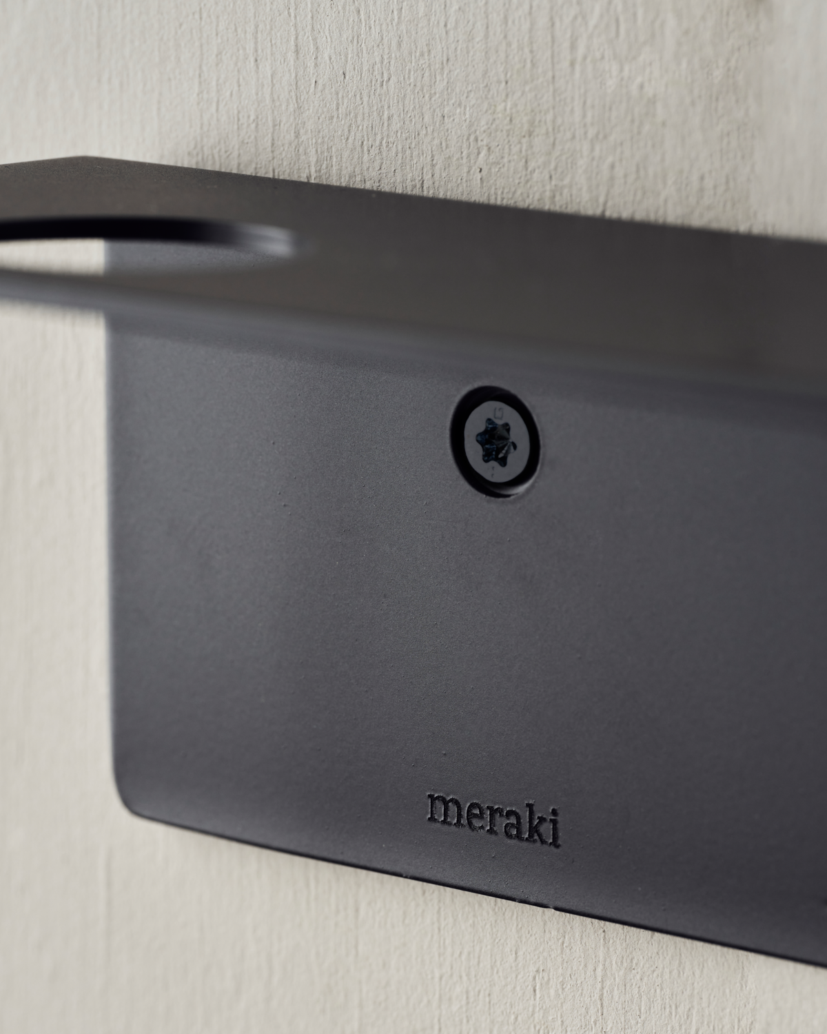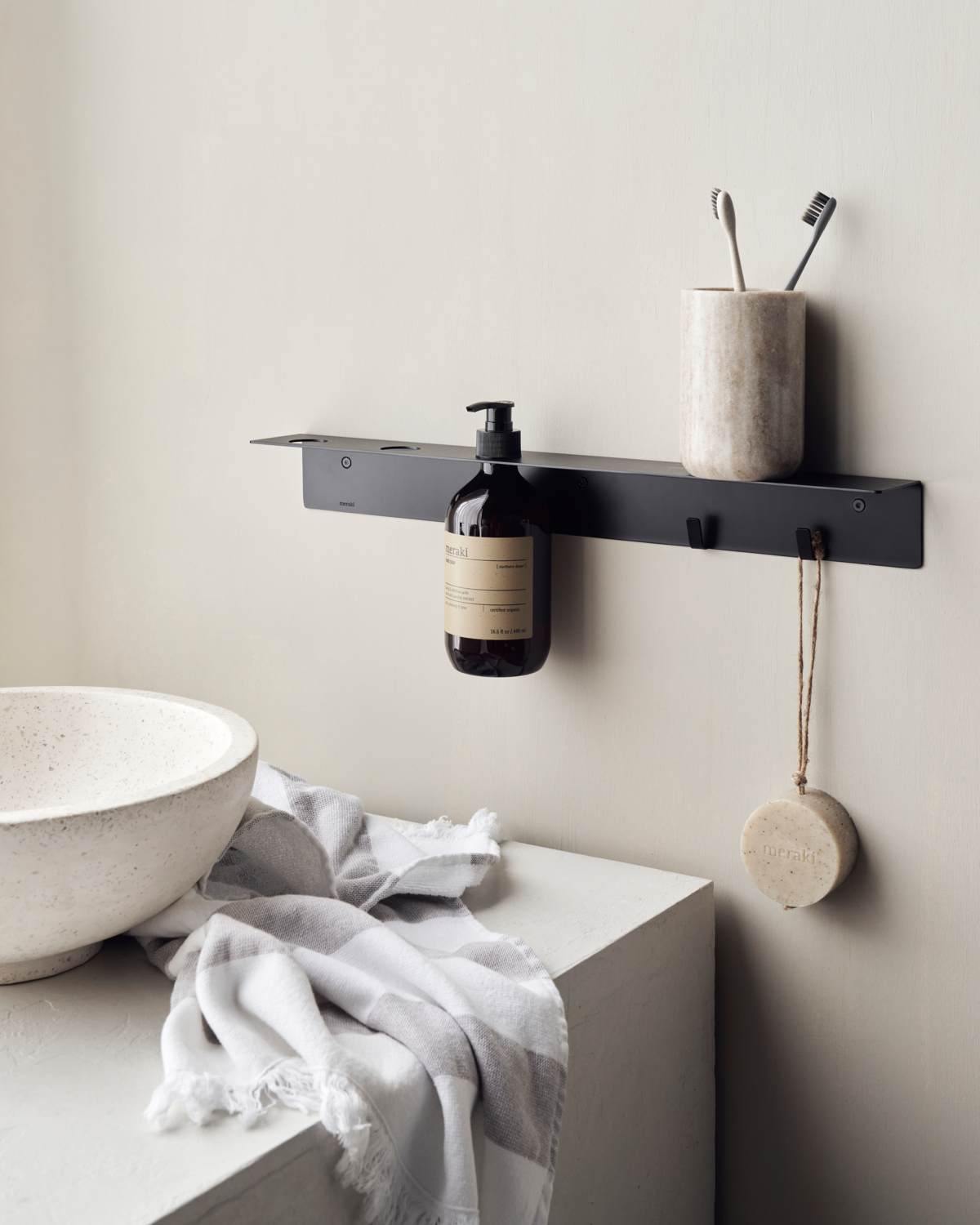 Schaff dir etwas Platz im Bad und werte deine Deko mit diesem Regal mit Flaschenhalterung und Hakenleiste auf. Es können drei Pflegeproduktflaschen aufgehangen und weitere Produkte auf dem Regal platziert werden. Außerdem kannst du deinen Luffaschwamm und andere Accessoires an den Haken aufhängen. Der rostfreie Edelstahl wurde mit einem gebürsteten schwarzen Finish überzogen, das kein Wasser durchlässt. Egal ob du es in der Dusche oder an der Badezimmerwand anbringst, dieses Regal von Meraki bringt sofort Style und Ordnung in dein Bad