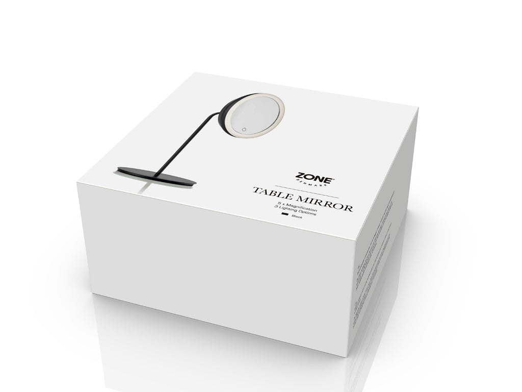 Tischspiegel mit 5-facher Vergrößerung und lichtaktivierender Touch-Funktion. 3 verschiedene Lichtintensitäten, schaltet sich nach 10 Minuten automatisch ab.
